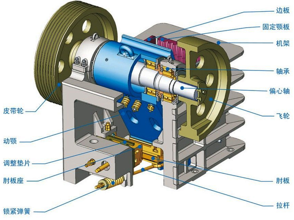 當(dāng)破碎機(jī)中落入不能破碎的物料而使機(jī)器超過(guò)平常負(fù)荷時(shí),肘板傳動(dòng)裝置可以實(shí)現(xiàn)自動(dòng)折斷,讓PE顎式破碎機(jī)停止工作,避免整個(gè)機(jī)器的損壞,保障生產(chǎn)安全